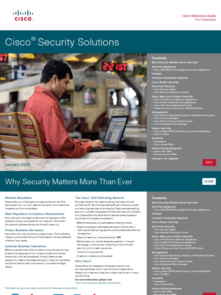 Quick Reference Guide. For Customers. January 2009. Cisco ® Security Solutions. Contents. Why Security Matters More Than Ever. Security Appliances • Cisco ASA 5500 Series Adaptive Security Appliance ... Doc Retrieval
